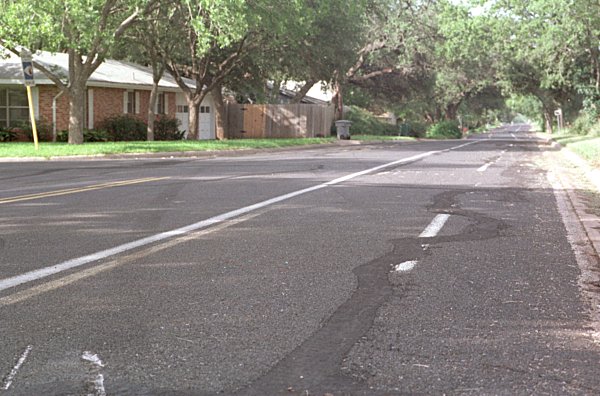 There were four people in this care, all about your age. The driver, a girl, and her boyfriend, sitting next to her, were killed by this accident. The passengers in the back seat were seriously injured. Estimates by my next door neighbor, who is an engineer and accident reconstruction expert, later confirmed by the survivors, were that they were traveling at about 85 mph (speed limit there is 30). There is a lump in the road, which you can barely see here: