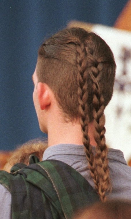 A newer style with the youth I noticed had the hair about 3-4" around the head, gathered in pointy little cone-shaped things. (Like a longer spike-type haircut that was popular in the mid-eighties.